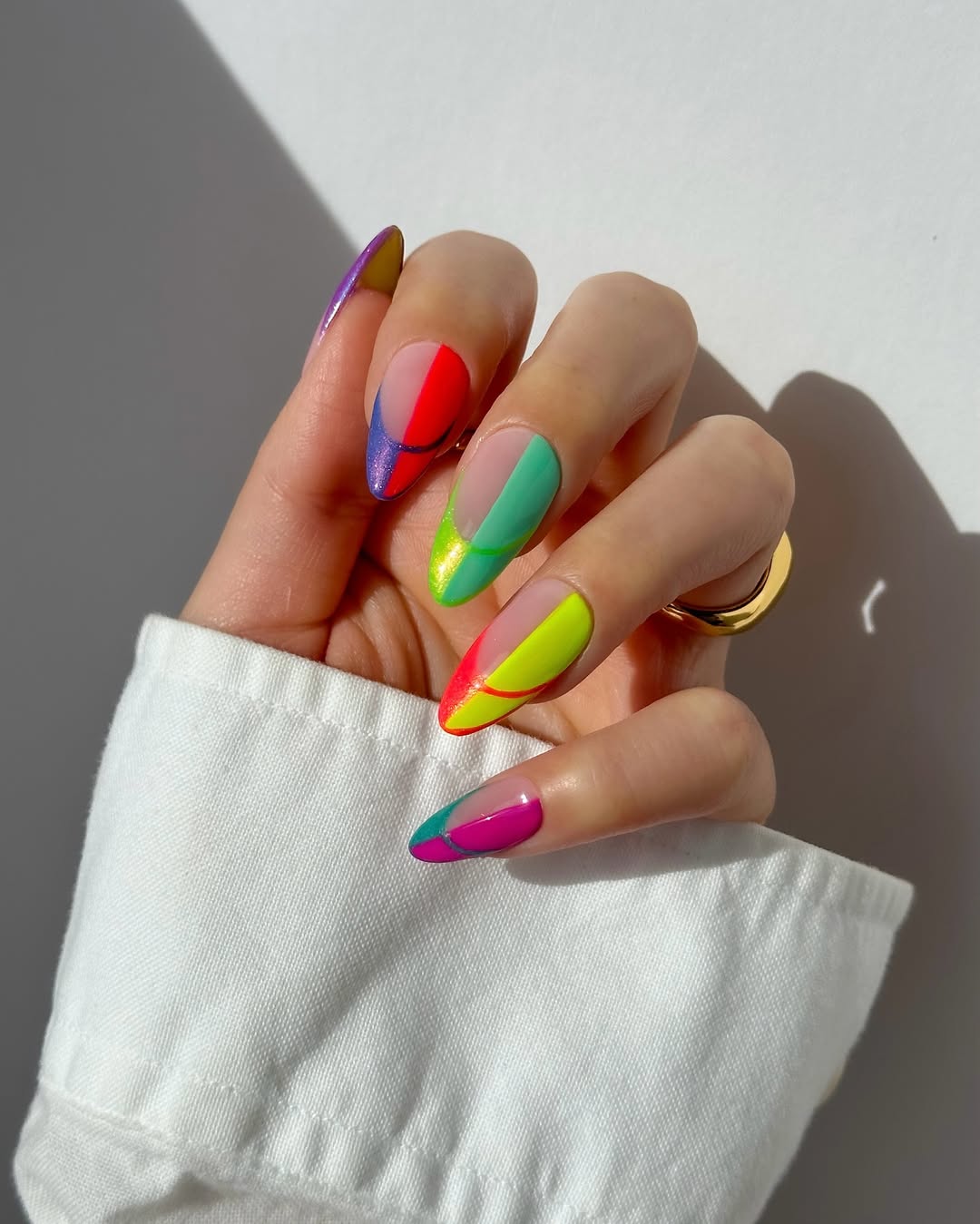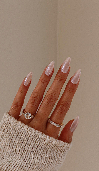 For a luxe look, go for almond-shaped nails with a neutral base and subtle chrome. This gives a soft glow that looks expensive and modern without being loud.