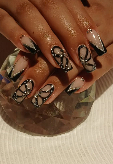 If your nails have gems or 3D elements, be mindful when washing your hair or putting on tight clothing, as these details can catch and lift.