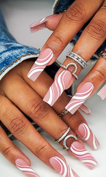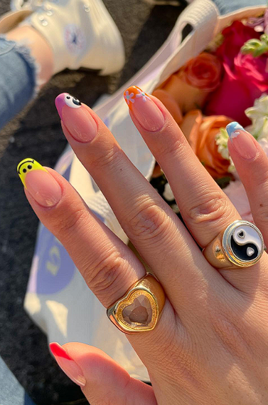 A popular choice is a soft pink base with tiny hearts, stars, or subtle confetti dots. Another cute option is a pastel French tip set where each nail has a different color tip. This style looks fun in photos and still feels polished.