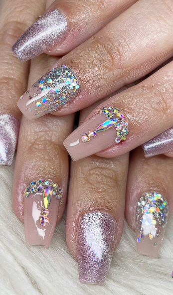 You can go full glitter on every nail for a dramatic look. Silver and champagne glitter are especially popular because they match almost any outfit. If you want something more wearable, do glitter accent nails and keep the rest neutral.