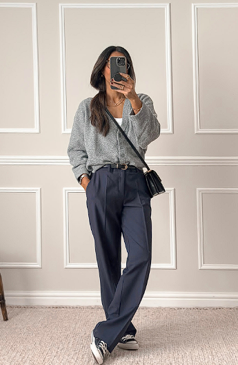 Choose comfortable fabrics in structured silhouettes, like knit tops with tailored trousers. Add a blazer, neat shoes, and a structured bag for polish.