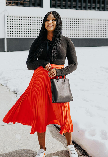 Midi skirts are versatile and comfortable. Pair them with a tucked-in blouse, a knit top, or a lightweight sweater. Finish with loafers, ankle boots, or low heels for a balanced office-ready outfit.
