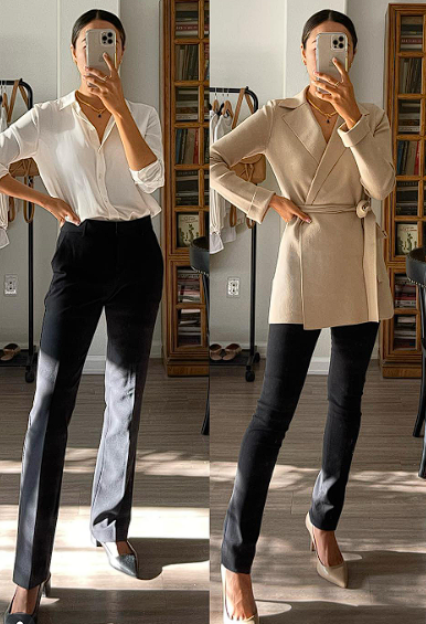 Wearing one color family from head to toe instantly looks polished. For example, beige trousers with a cream top and tan shoes, or all-black separates with subtle accessories, creates a sleek, modern office look.