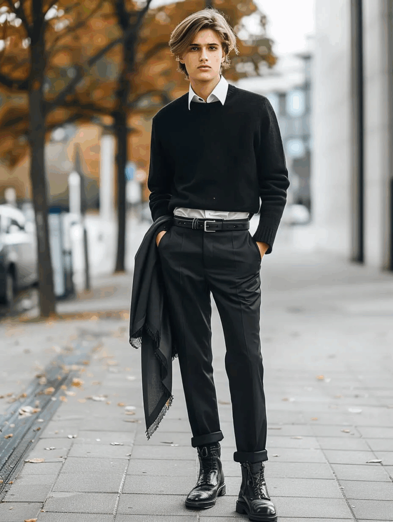 When the plan involves a nice restaurant or an occasion that matters, a dark shirt with tailored trousers is a strong choice. A black, deep navy or dark green shirt worn with slim charcoal or black trousers looks sleek and a little mysterious.