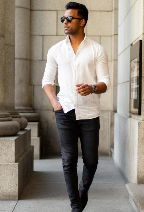 A well fitted white shirt and a pair of dark blue or black jeans is one of the easiest combinations to rely on. It feels clean, fresh and instantly put together without being too formal. Roll the sleeves to just below the elbow to keep it relaxed.