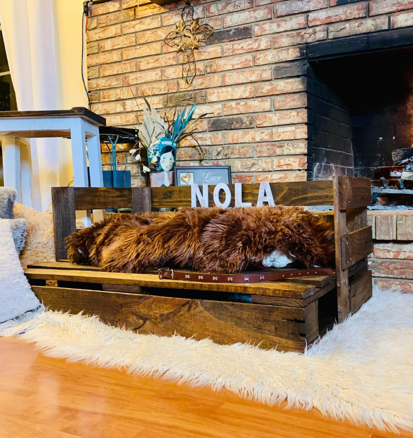 This rustic pallet wood bed features a custom name sign and luxurious bedding, transforming reclaimed materials into farmhouse-chic pet furniture. The natural wood finish and white faux fur create a cozy fireside retreat.