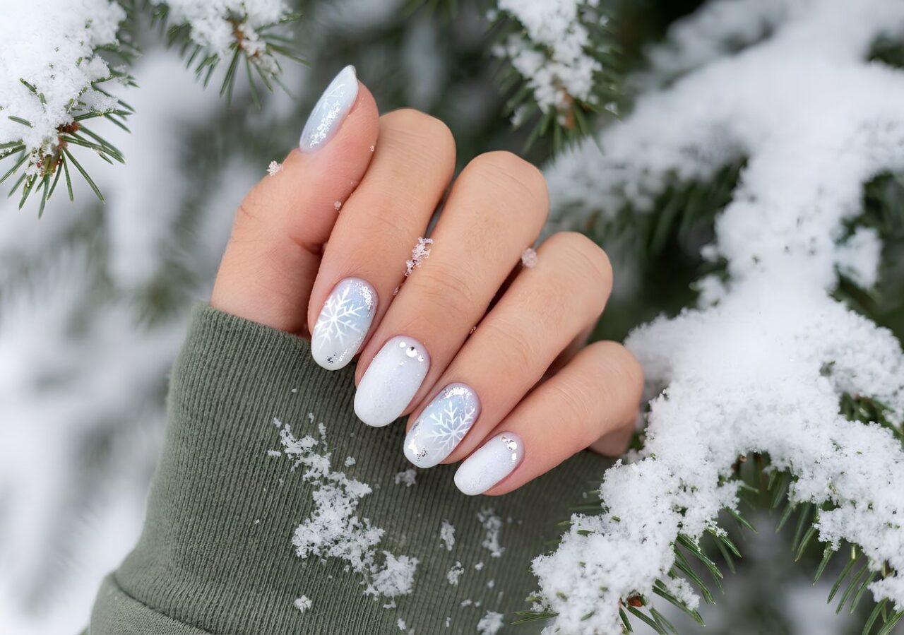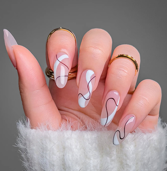 On a base of cool nude, greige or light grey, add very thin white lines or tiny abstract shapes on one or two nails. Think small waves, loops or simple branches. The result is delicate and wintry without being too literal.