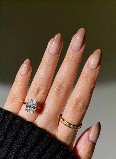 If you like light nails, switch from pure nude to milky beige with a fine shimmer mixed in. It catches indoor light softly without feeling like full glitter. This look suits office days, dinners and quiet evenings in equal measure.