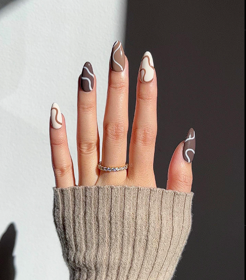 Create a colour block look by painting half the nail chocolate brown and the other half soft cream, divided diagonally or vertically. These early winter nails echo hot chocolate and marshmallows, perfect for cozy weekends.