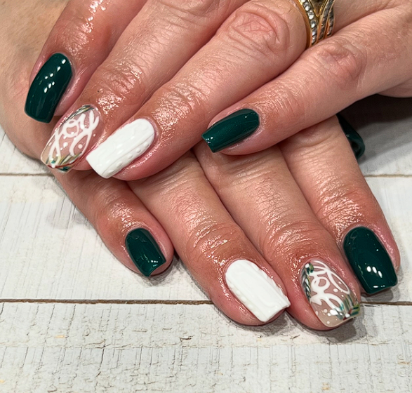 Choose a warm nude base and add a simple cable knit pattern on one or two accent nails using the same colour in a thicker gel. The tone on tone pattern gives your early winter nails a cozy sweater look without bright colours or heavy contrast.