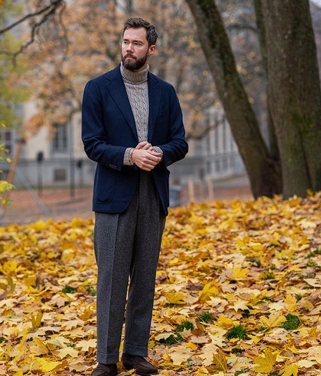 Layer a fitted turtleneck under a structured blazer and pair it with dark blue or black jeans. The turtleneck gives warmth around your neck, the blazer adds polish and the denim keeps the outfit relaxed.