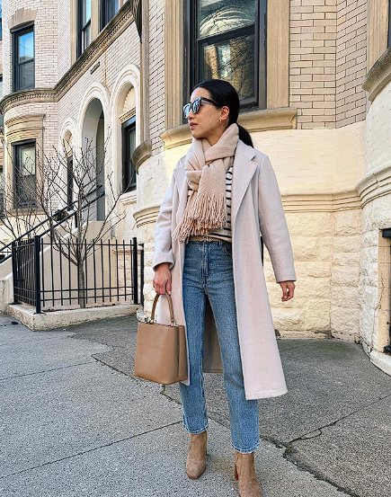 Start with a simple base: straight leg jeans and a medium weight knit. Add a long wool or wool blend coat in camel, grey, navy or black.