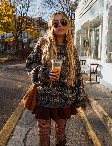 Mixing textures is one of the secrets to good early winter outfits. A chunky knit sweater with a satin or silky midi skirt gives you warmth on top and smooth movement on the bottom.