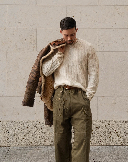 Choose warm neutrals like cream with camel, or grey with dark brown. Finish with ankle boots or lace up shoes. This combination feels especially right for countryside weekends and cozy days.