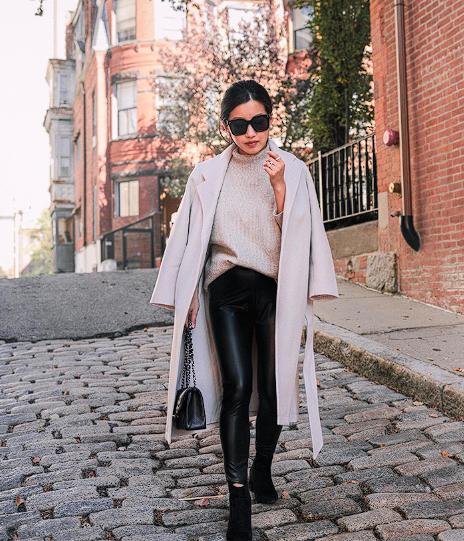 Pair a leather or faux leather jacket with a turtleneck and a midi skirt. The jacket adds edge, the turtleneck adds warmth and the skirt keeps it feminine.