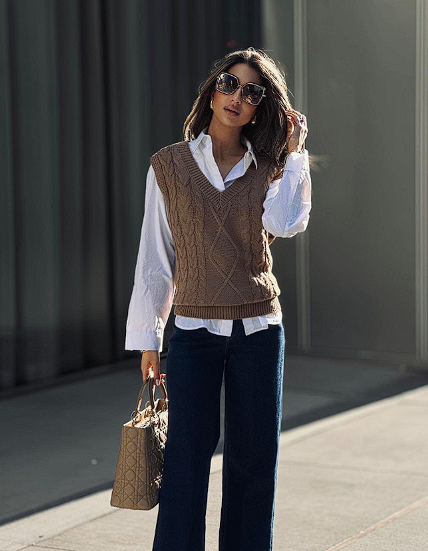 Layer a blouse with a collar under a chunky knit vest. Pair with straight trousers, jeans or a midi skirt.