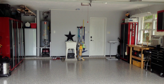 Bright red and black cabinets along the walls provide closed storage while maintaining a spacious center area. The polished floor reflects light throughout the space, and wall-mounted organization keeps the room feeling open and clutter-free.