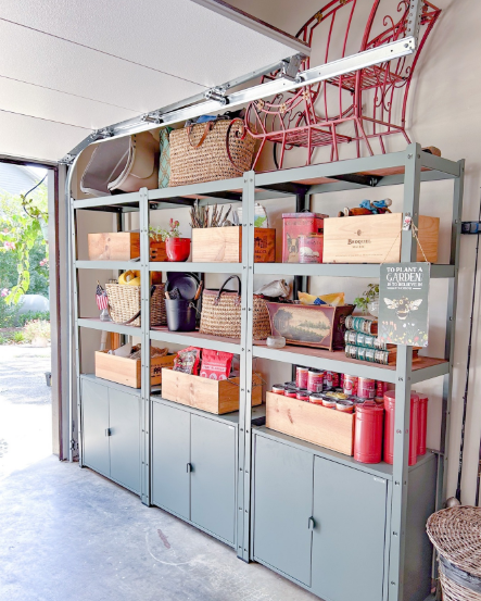 This garage features gray cabinets on the bottom with open shelving above, displaying wooden crates, wicker baskets, and colorful organization supplies. The pink bicycle mounted near the door adds a cheerful touch while a decorative garden sign provides personality to the practical space.