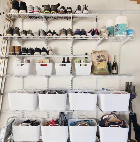 Floor-to-ceiling white wire shelving creates an organized system using matching white bins for a cohesive look. Shoes line the upper shelves while larger storage containers on lower levels hold everything from cleaning supplies to sports equipment in this bright, clean space.