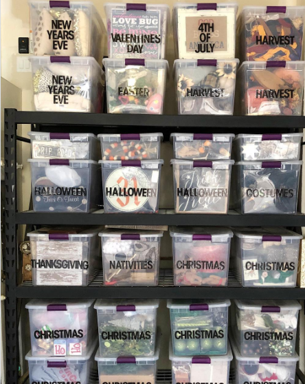 Clear labeled bins stacked on black metal shelving make finding seasonal decorations effortless throughout the year. Each holiday has its own designated containers with bold labels like “Halloween,” “Christmas,” and “Easter,” eliminating the annual hunt for decorations.
