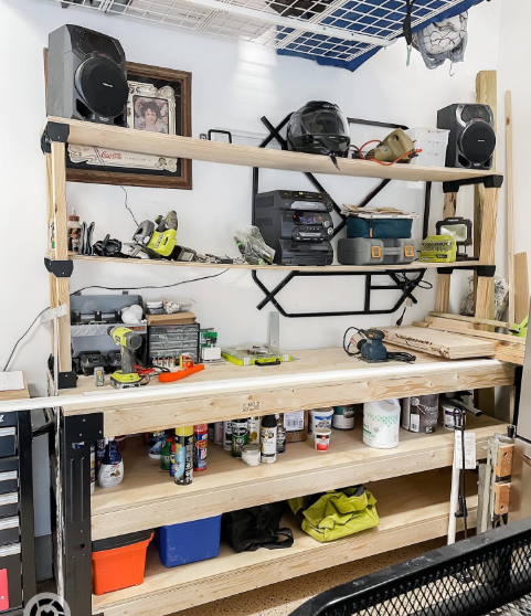 A custom-built wooden workbench with open shelving provides the perfect setup for tools and equipment. Power tools, storage containers, and supplies are neatly arranged on natural wood shelves, while the lower shelf houses paint cans and larger items within easy reach.