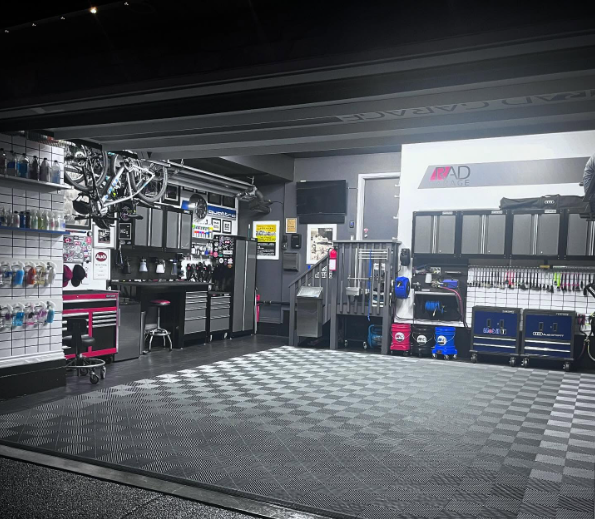 This sleek garage features a black and gray color scheme with professional-grade tool chests and a checkered floor that looks showroom-ready. Wall-mounted storage systems and overhead bike racks maximize every inch of vertical space while maintaining a clean, automotive workshop aesthetic.