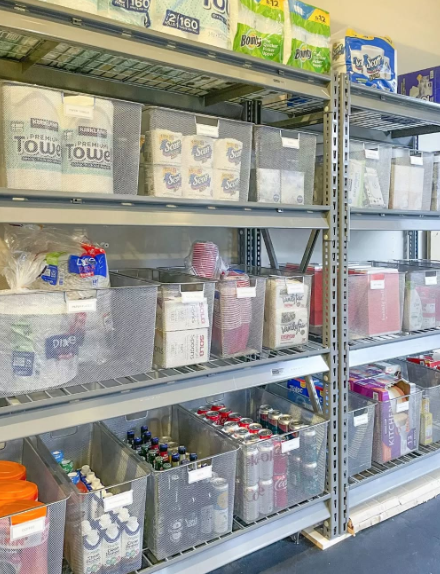 Metal shelving units organize bulk items from paper towels to party supplies in mesh bins and clear containers. The top shelf holds larger items while middle and lower shelves use dividers and bins to corral everything from nail polish to tortilla chips.
