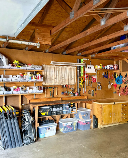 A garage with exposed wooden beams features a pegboard wall for tool organization alongside wooden shelving units. The rustic ceiling adds character while storage bins, a workbench, and carefully hung tools create a functional workspace for any DIY project.