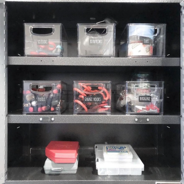 A metal cabinet with pull-out drawers keeps small tools sorted by category in clear labeled bins. The compact design maximizes storage efficiency with scissors, headphones, tape, garage hooks, and hardware all having designated compartments.