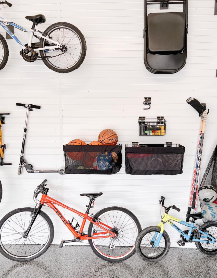 Wall-mounted systems keep sports equipment like golf bags, scooters, and outdoor toys off the floor and organized. Metal shelving units with wire drawers store smaller items while larger equipment hangs from specialized hooks designed to prevent damage.