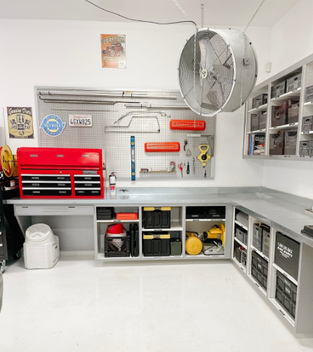 A white L-shaped workbench with custom built-in storage cubbies creates the perfect workspace for projects. Vintage automotive signs and a large industrial fan add character while pegboard walls and organized storage bins keep tools within arm’s reach.