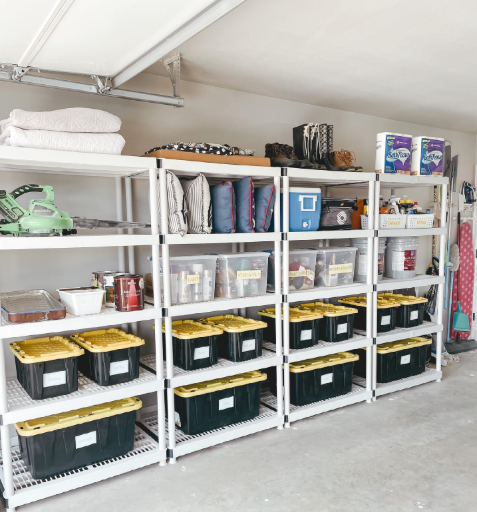 This garage showcases white utility shelving units filled with dark green and yellow storage bins, creating a uniform and accessible system. The upper shelves hold seasonal items and larger containers, while clear bins on middle shelves make it easy to identify contents at a glance.