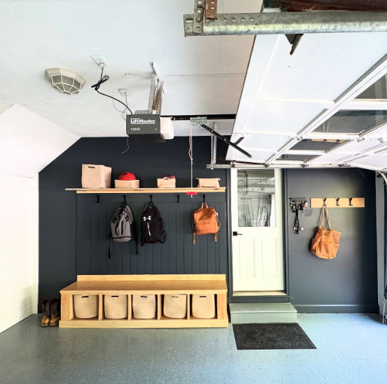 A dramatic dark navy feature wall with natural wood accents creates a stunning entryway zone with hooks for bags and a bench with fabric storage bins. The contrasting white walls and modern lighting fixture elevate this garage space into an extension of the home’s interior design.