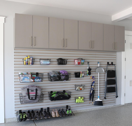 Gray overhead cabinets pair with a slatwall panel system that holds baskets and accessories at eye level. The combination of closed and open storage provides flexibility while maintaining a clean appearance with everything from sports equipment to cleaning supplies neatly contained.