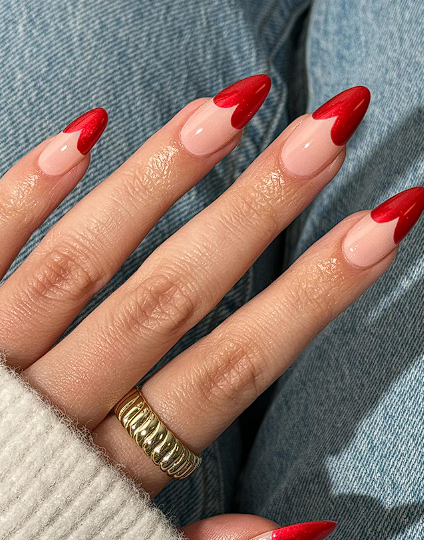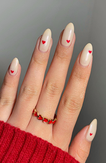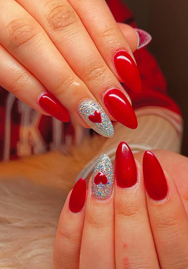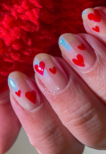 A glossy nude base with small red hearts looks elegant and refined. A red French tip with a tiny heart detail feels modern and chic. If you want something bold, you can do a full red manicure with one white accent nail featuring a heart design.