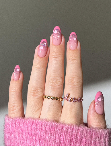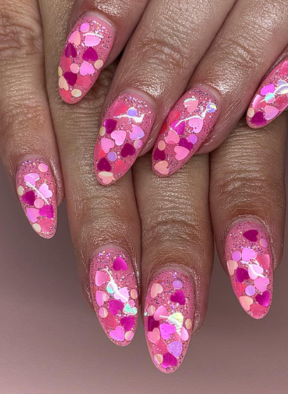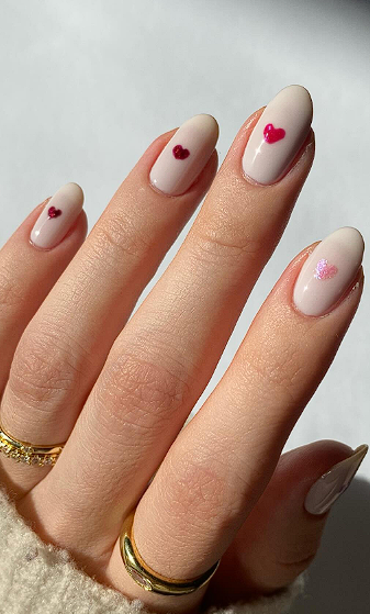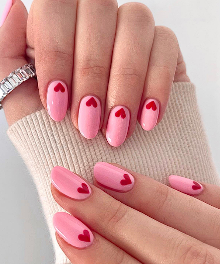 A popular cute style is a pink base with scattered tiny hearts, like confetti. Another fun option is alternating solid nails with heart accent nails, keeping the design balanced.