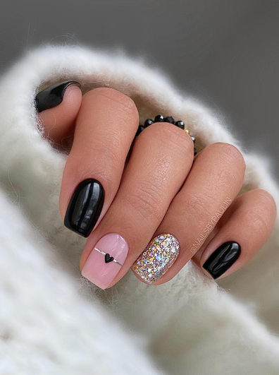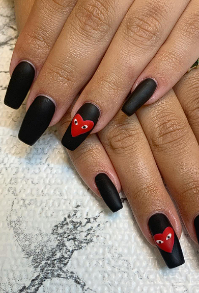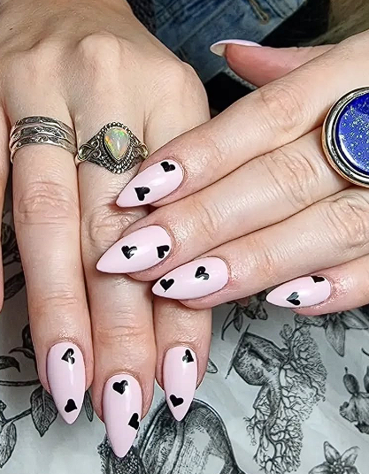 A white base with tiny black hearts looks clean and trendy. A nude base with black heart outlines feels minimal and chic. You can also do a black manicure with one white accent nail featuring a heart design for a bold look.