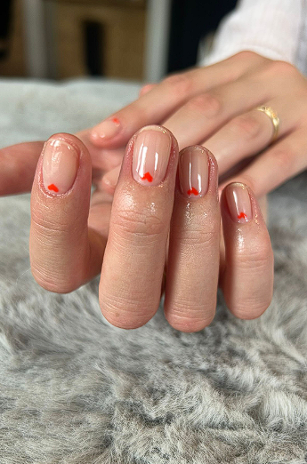 In winter, deep red hearts on a nude or milky base feel cozy and festive. In spring, pastel heart designs look fresh and soft. In summer, bright hearts in orange, pink, or coral feel playful and fun. In fall, earthy tones like brown, beige, or muted red hearts can look surprisingly chic.