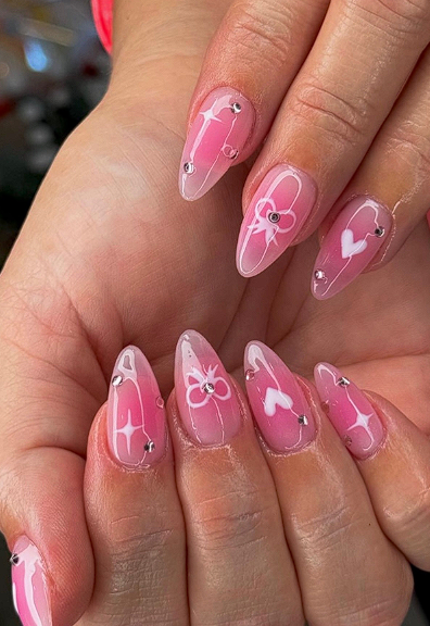 Baby pink nails with tiny white hearts look delicate and pretty. A nude base with hot pink hearts feels playful and modern. You can also do an ombré pink base with heart accents for a dreamy, layered look.