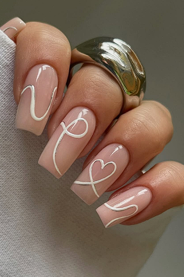 A nude or milky base with tiny heart accents, heart outlines, or micro French tips with a small heart detail looks classy and polished.