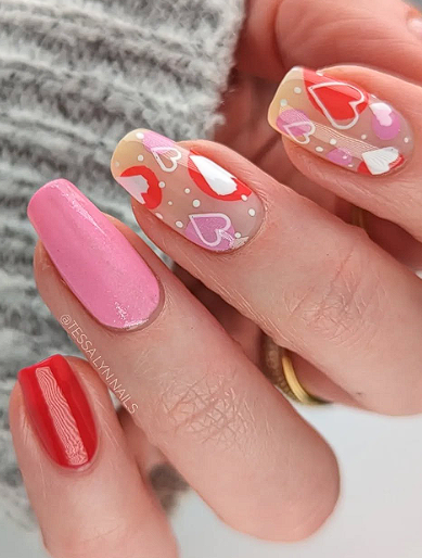 You can also do mismatched heart nails where each nail has a slightly different heart pattern or placement. The key is keeping the palette cohesive so the set still looks intentional.