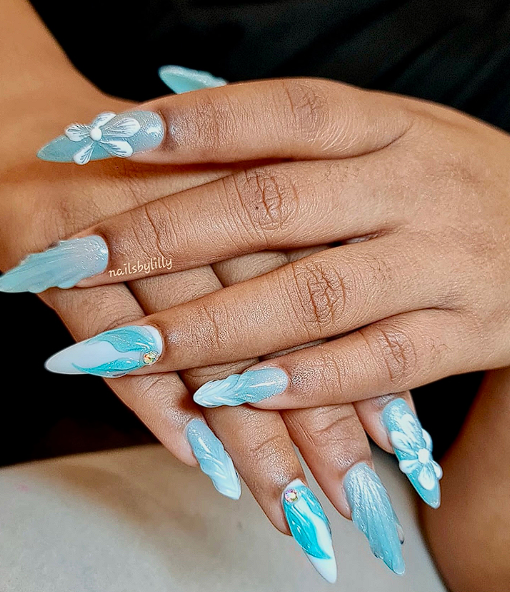 Choose a soft pastel version rather than a bright summer blue. On almond or oval nails, icy blue looks elegant and a little dreamy.