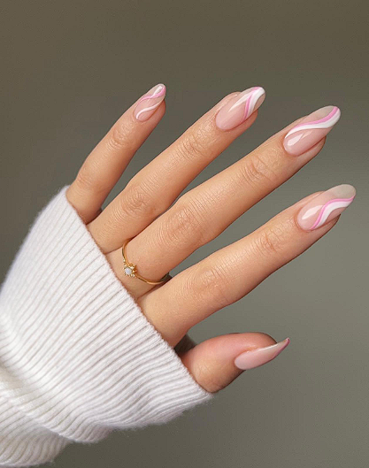 On a sheer or very light nude base, draw thin white lines that curve across one or two nails. Keep them minimal and spaced out.
