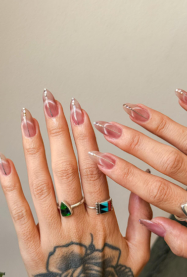 A sheer nude base with a single thin silver line on one or two nails gives a hint of shine that still feels calm after holiday glitter.