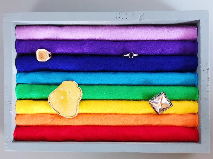 This colorful organization method uses rainbow-colored rolled felt to store rings, preventing tarnishing and scratching. The vibrant display makes it easy to coordinate jewelry with your outfit while protecting your collection.