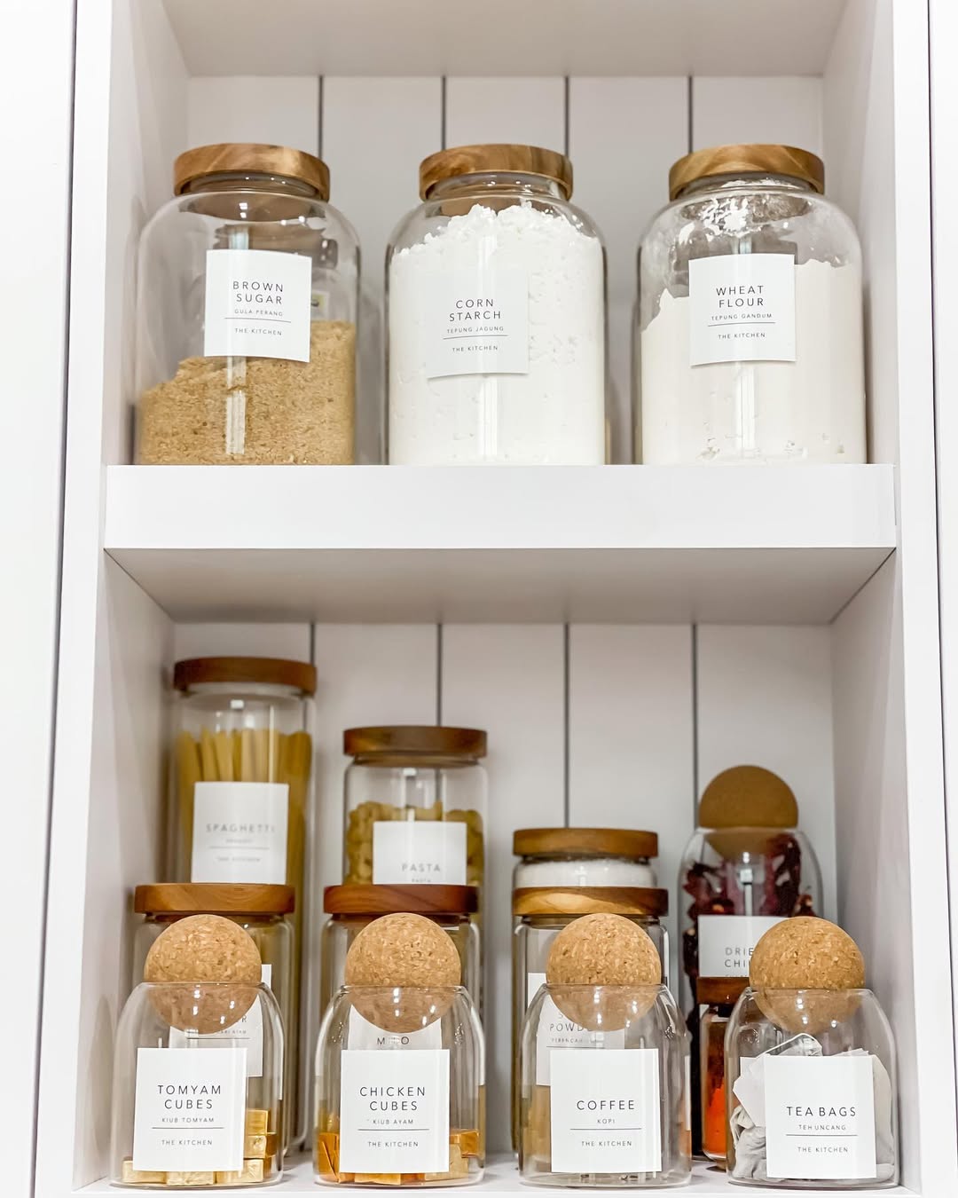 Matching glass jars with bamboo lids and simple black labels create a cohesive look for storing baking essentials like flour, sugar, and pasta. The uniform containers stack efficiently while the clean aesthetic makes the pantry feel like a curated collection rather than cluttered storage.