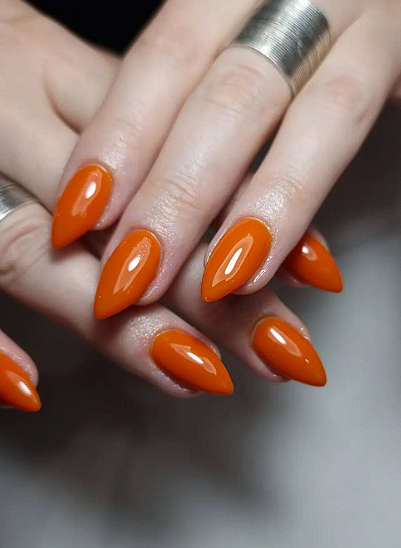 Solid orange nails work especially well on short nails because the color stands out without needing extra design. On long nails, a solid orange set can look dramatic and fashion-forward, especially with almond or coffin shapes.