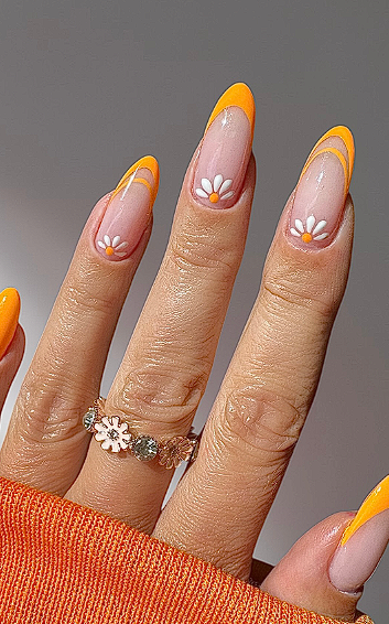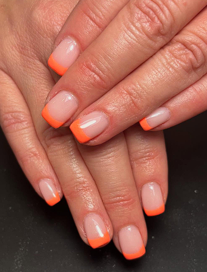 Orange French tips on a nude base are one of the most wearable options. They look clean, modern, and not too bold.