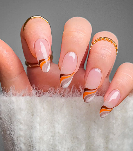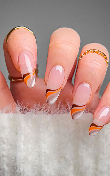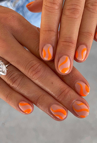 Abstract swirls are one of the most popular options. A nude base with orange swirls looks trendy and stylish. Minimal geometric lines in orange and white can also look sleek.
