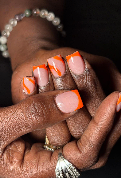 A nude base with thin orange tips looks modern and chic. You can do a micro French tip for a minimalist vibe or a thicker tip for a bolder look. Another trendy option is a double French tip, where you add two thin orange lines at the tip.